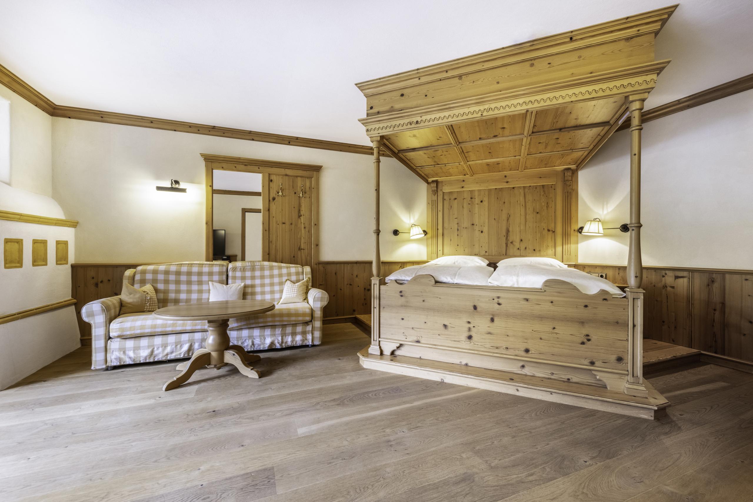 1 double room Piz la Ila in Tyrolean style of 45/50 m², wooden floor, with bath and shower, separated toilet, living-room corner, minibar, balcony and Dolomites view.