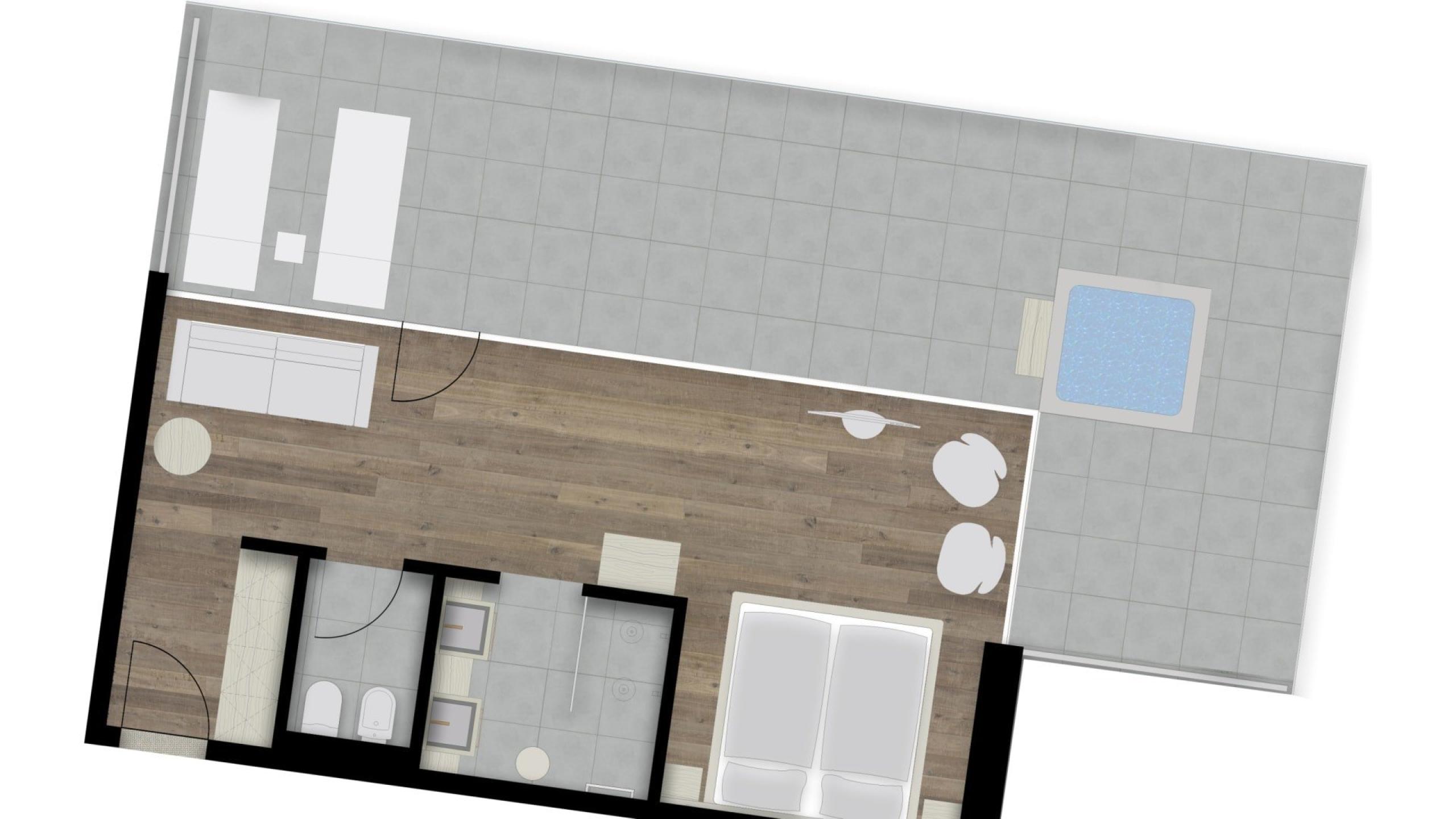 Large balcony with table, chairs, deck chairs and private luxury whirlpool (25-30m²)