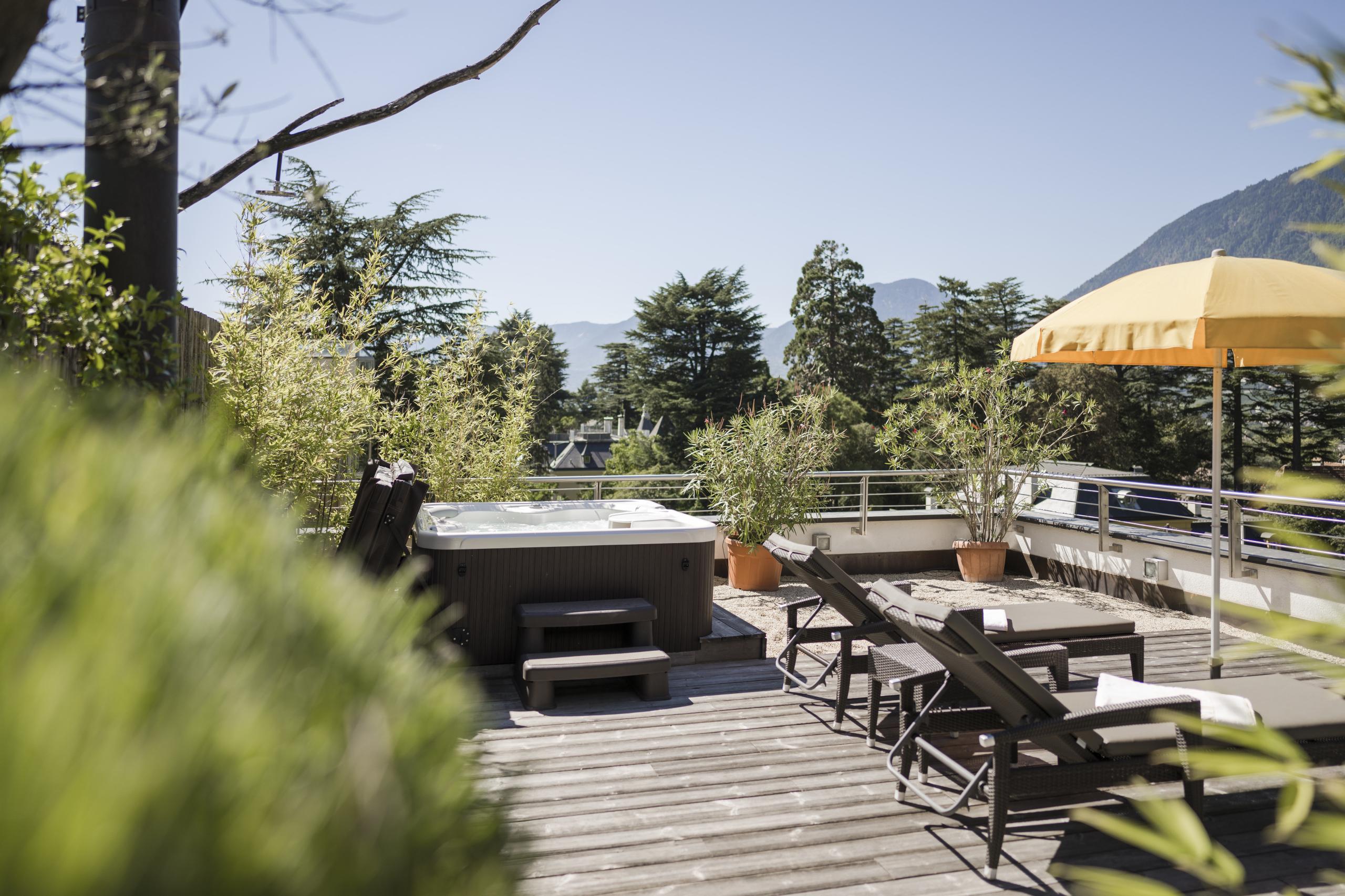 Large exclusive luxury suite, bedroom with king-size bed in fine leather and memory foam mattress | private roof terrace with whirlpool | 360° Merano mountains view| wooden floors | large bathroom with natural light | steam sauna | whirlpool | bidet | hairdryer | makeup mirror | exclusive high-quality L'Occitane care products | living room with leather sofa and fireplace | two flat screen TVs | WiFi | phone | radio | AC | in-room safe | kettle with selection of teas | minibar | Nespresso machine | trekking backpack | South Tyrolean apples as a welcome gift | fresh flowers from our garden | Loacker treats | praline bombons