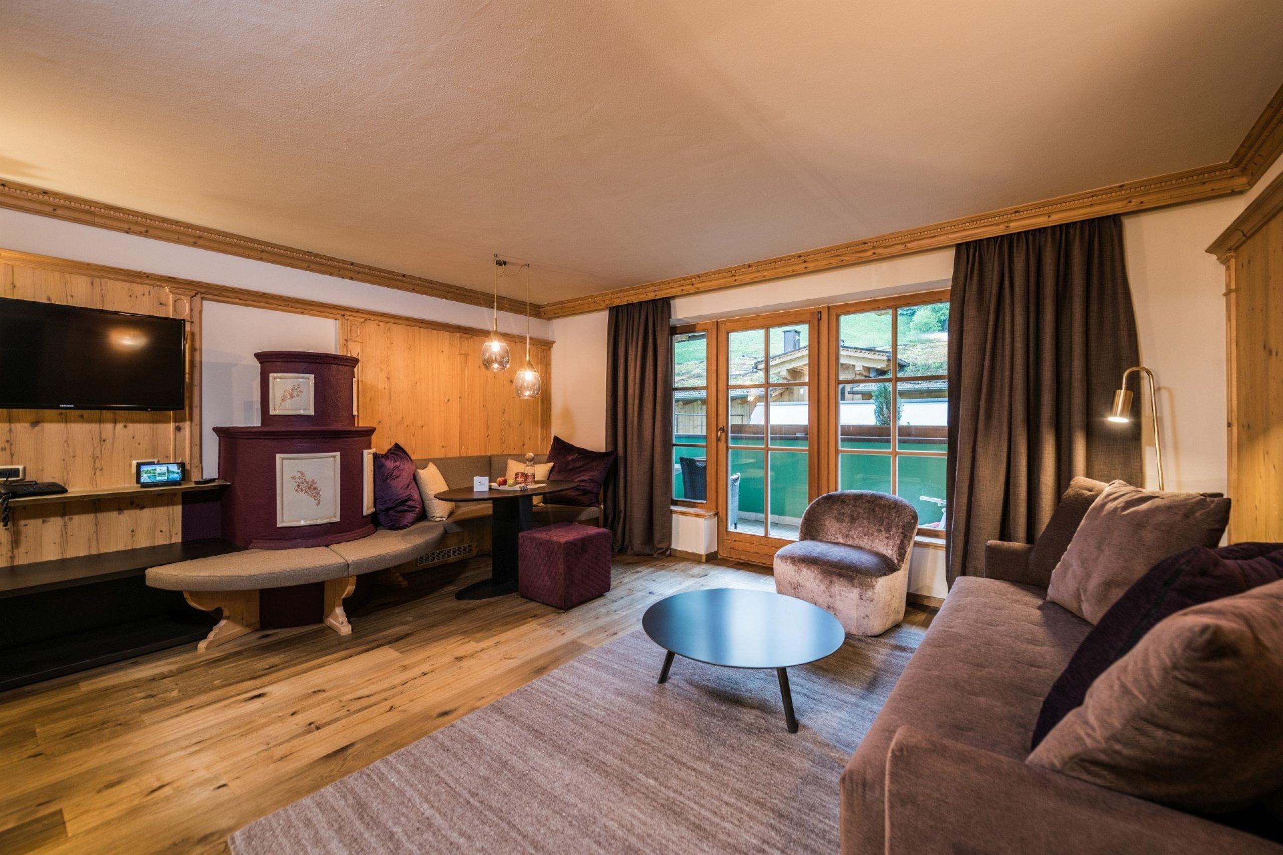 Exclusively decorated in aged pine. A spaciuos, alpin-modern two room apartment, bedroom and sitting room with wood burning ‘Kachelofen’, espresso machine & tea set, luxury bath and shower, separate WC/bidet and sunny balcony with panoramic view.