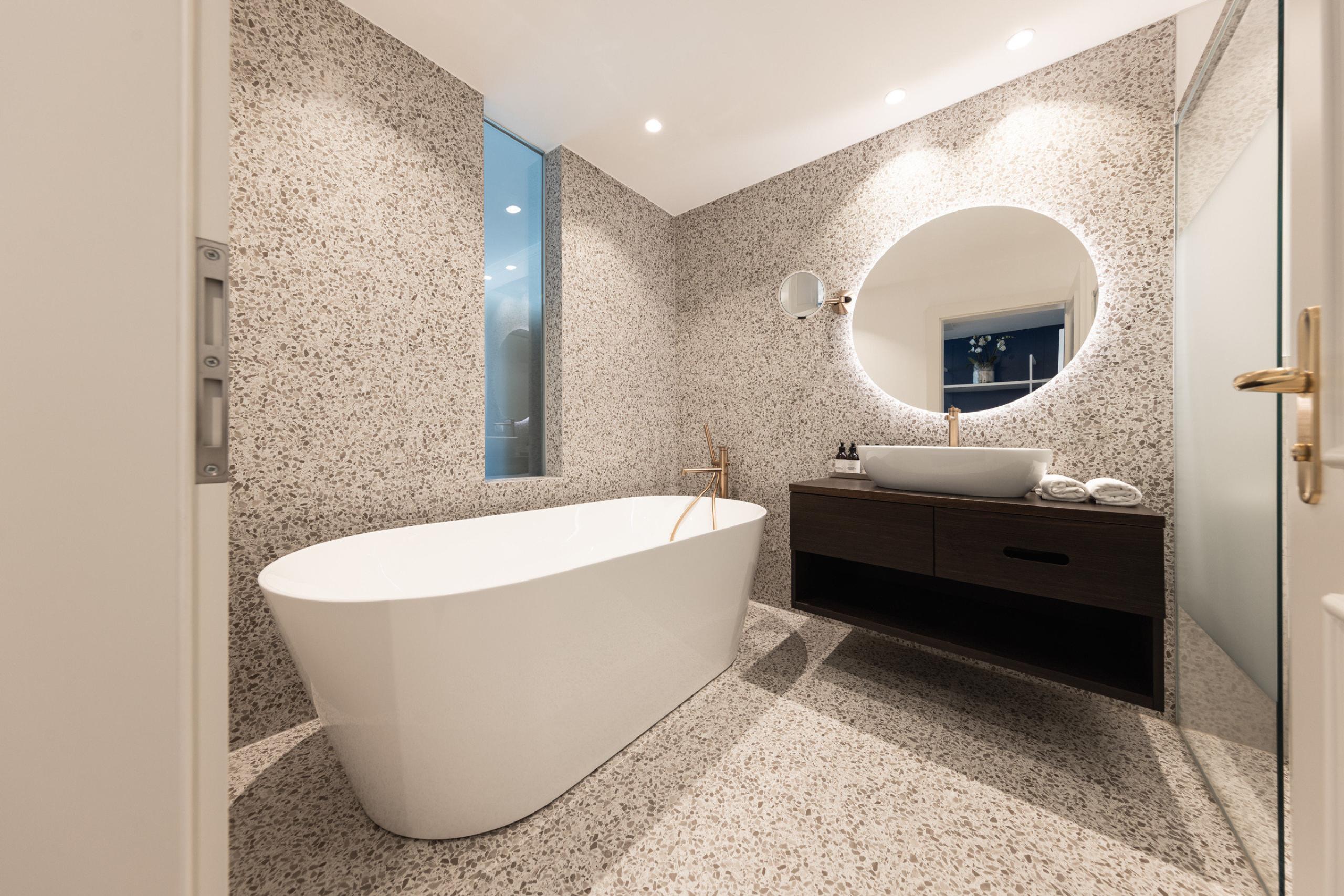 Room setup: parquet floor, air conditioning, TV, coffee machine, hiking backpack, separate living room and bedroom with comfortable sofa, stylish furnishings, two bathrooms, one with a bath tub, WC and bidet, the other with shower, WC and bidet, high-quality beauty products, hairdryer, wellness bag with fluffy bathrobe and bath towels, free WLAN, minibar and wine minibar, safe.