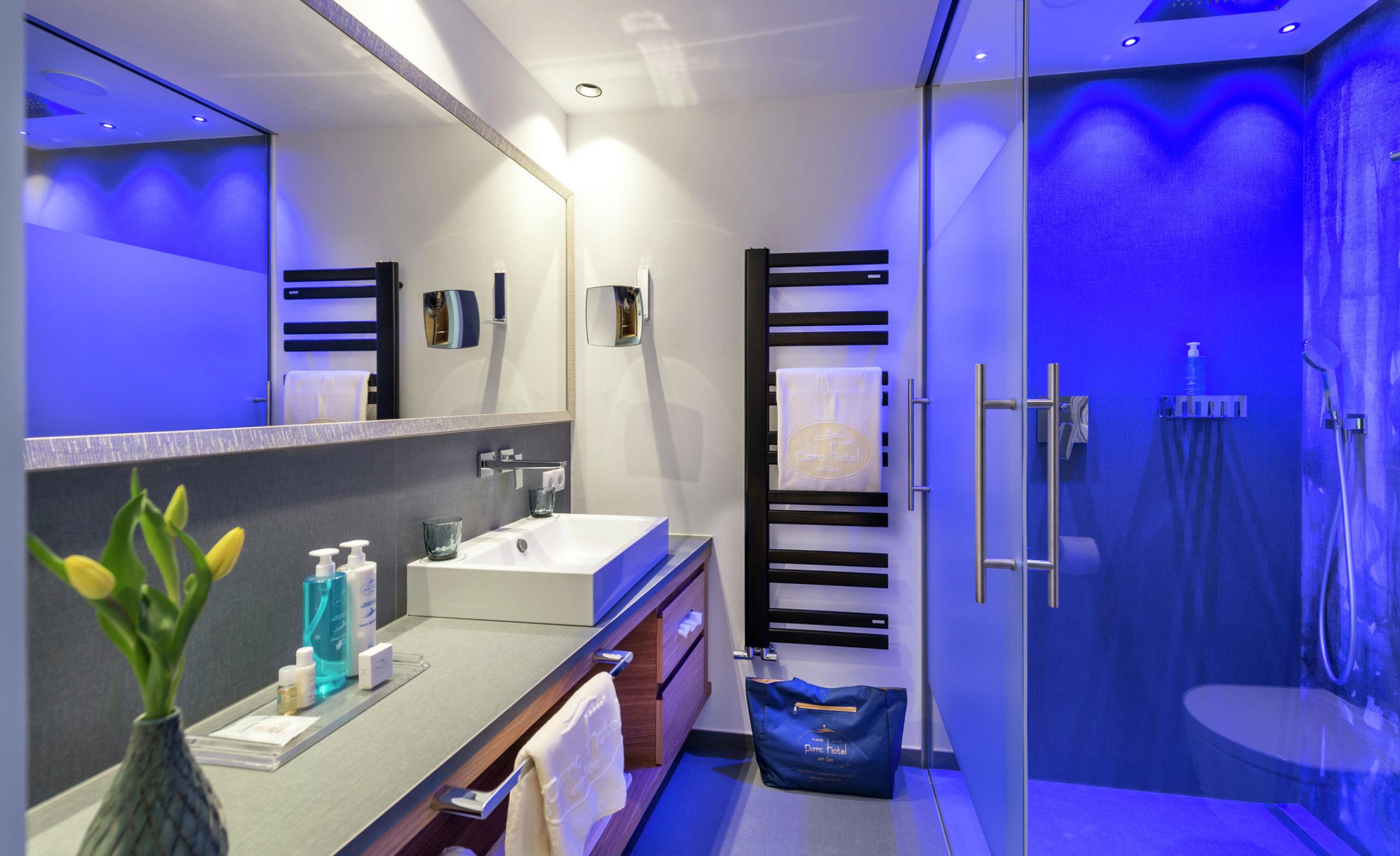 Room setup: parquet floor, air conditioning, TV, hiking backpack, modern and stylish furnishings, box-spring beds, modern bathroom with shower and toilet, separated by a sliding glass door, high-quality beauty products, hairdryer, wellness bag with fluffy bathrobe, bath towels and slippers, free WLAN, minibar, safe.