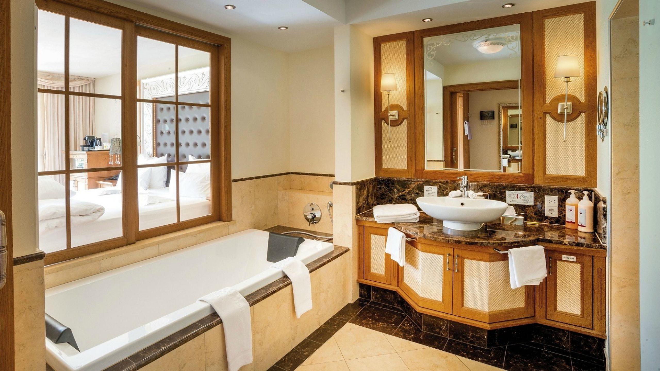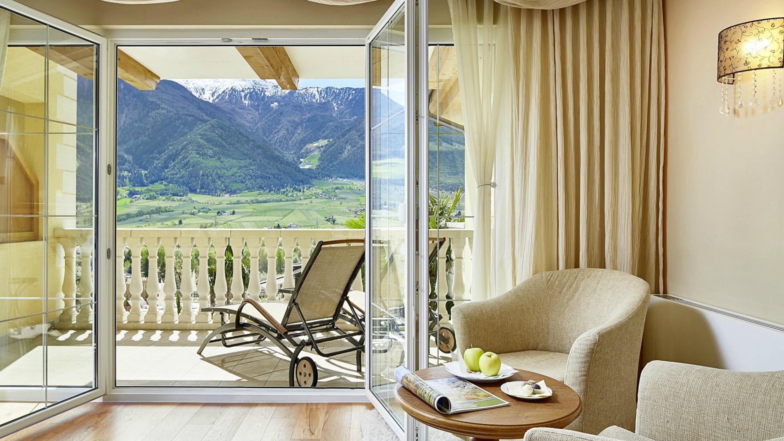 52m² including 10m² southern-facing setting with panoramic view, classic, elegant natural wood furnishings, luxury box-spring bed (king size 200x210cm) with Sleep-Fit Health-System, comfort cabinet system, writing and work table, 55" Smart-TV with Google Chromecast, small bar with wine, Nespresso & tea desk, spacious luxury bathroom with relaxing shower for two, romantic bath, noble washbasin, separate toilet and bidet, southern-facing setting and comfortable relaxation furnishings, no animals. In our Sonnenschlössl.