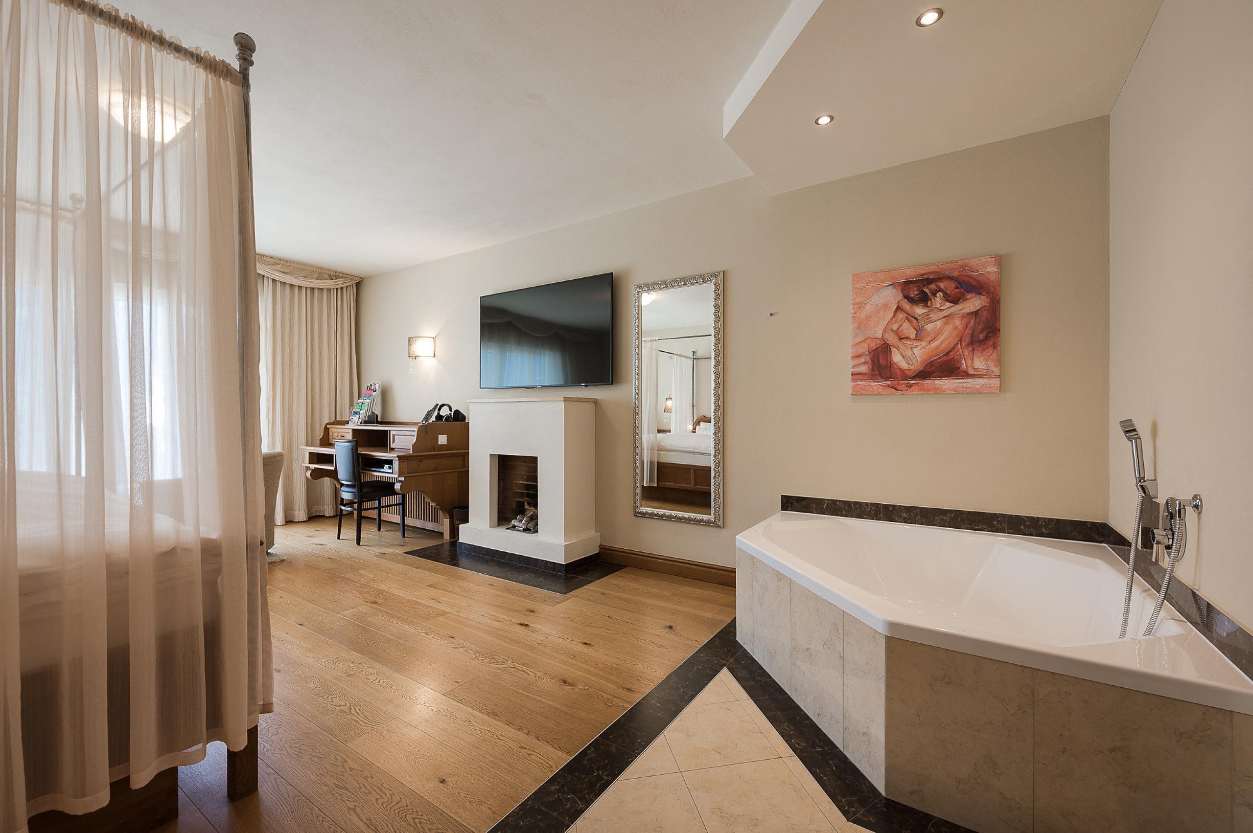 48m² including 6m² southern-facing setting with panoramic view, classic, elegant natural wood furnishings, luxury "Romantic dream" canopy bed (king size 200x210cm) with Sleep-Fit Health-System, walk-in cabinet area, writing and work table, romantic fireplace, 55" Smart-TV with Google Chromecast, small bar with wine, Nespresso & tea desk, spacious luxury bathroom with relaxing shower for two, romantic open-space bath, noble washbasin, separate toilet and bidet, southern-facing setting with views overlooking the mountain landscape of South Tyrol and comfortable relaxation furnishings, no animals. In our Sonnenschlössl.