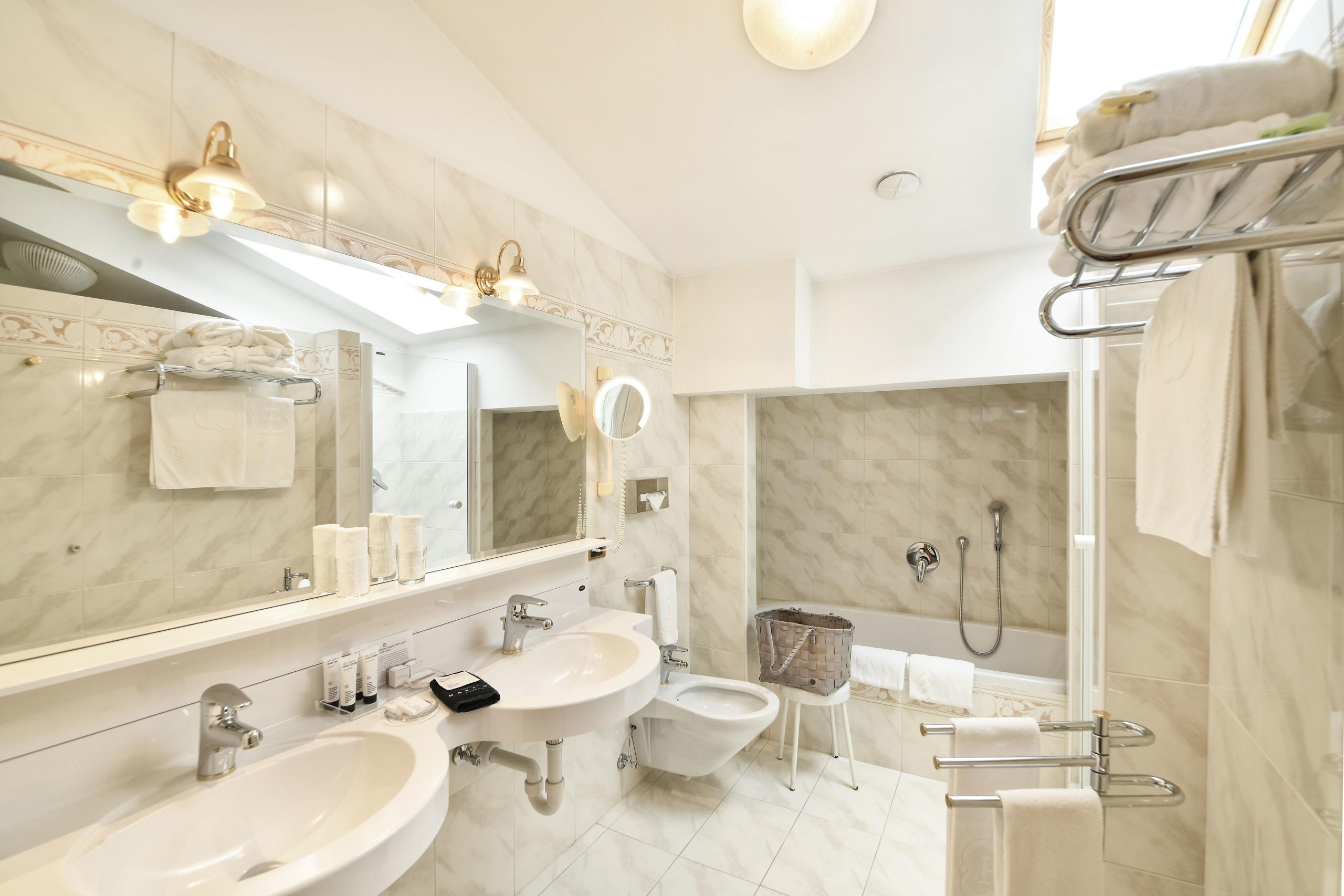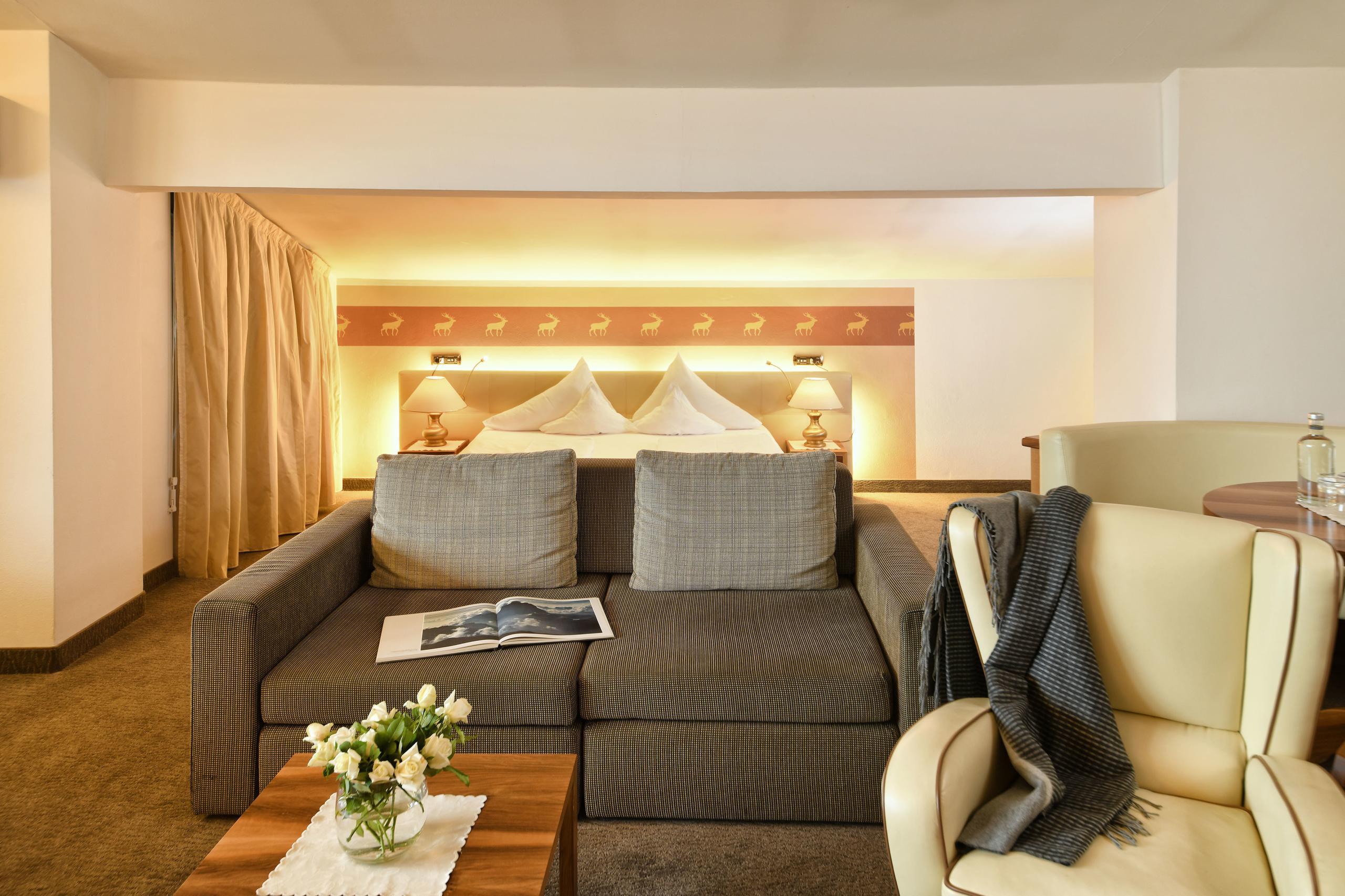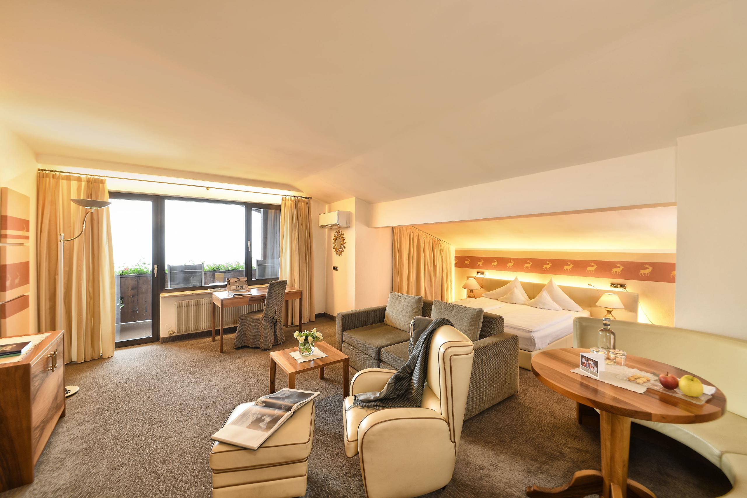 Ein elegantes Doppelzimmer mit leichter Dachschräge und einem Balkon, der mit Blick nach Meran die schönsten kurstädtischen Urlaubserinnerungen prägt – das ist das Doppelzimmer Juval. Exklusives Nussholz-Mobiliar und hochwertige Materialien machen es zu einem unvergesslichen Wohlfühl-Juwel in der obersten Etage des Stammhauses!