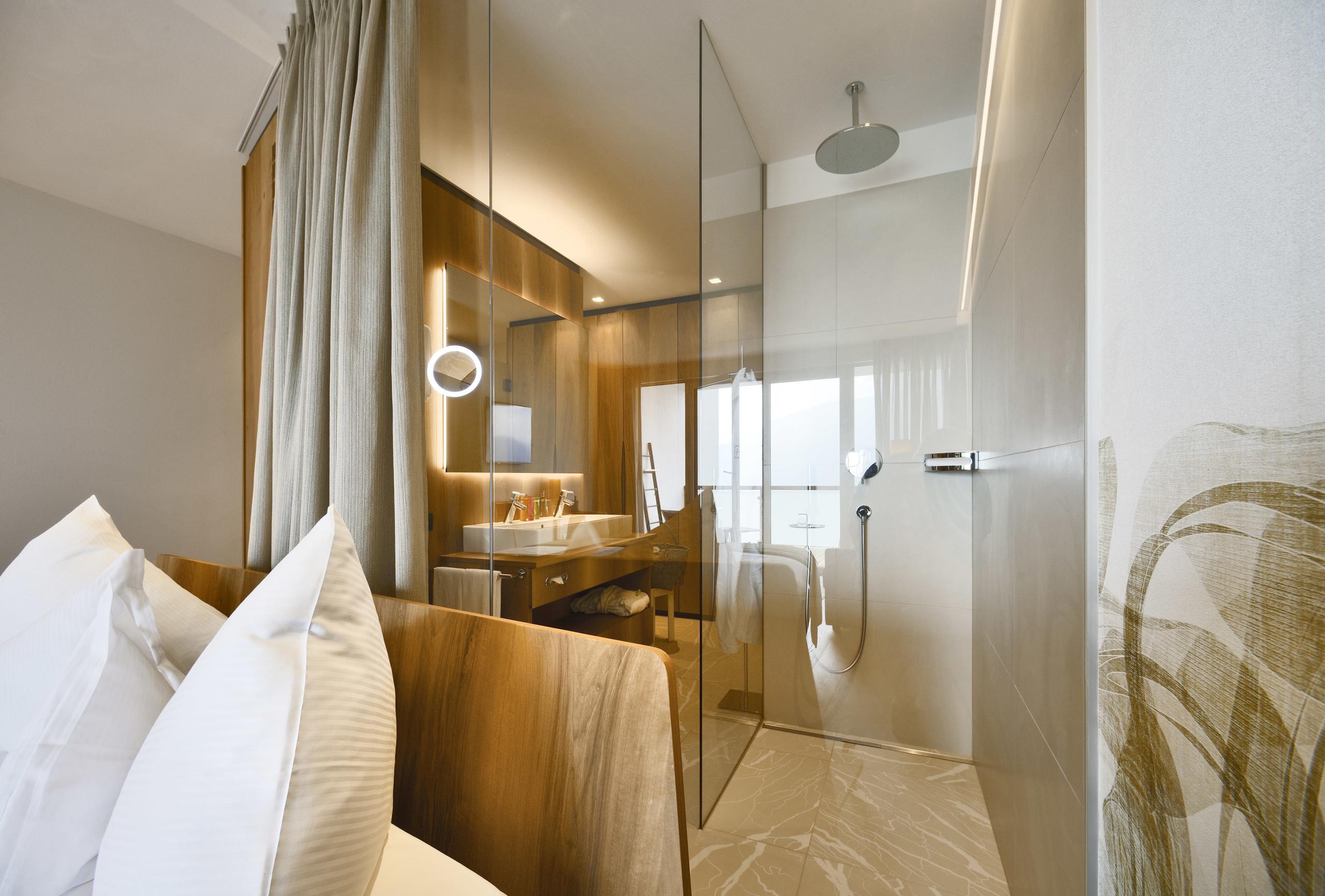 Moderne Grüntöne, hochwertige Möbel und edle Holzböden verleihen dieser Juniorsuite im Haus Traube ihre ruhige, elegante Note. Das offene Wohn-Schlafzimmer geht fließend ineinander über und öffnet sich zum Balkon im vierten Stock, ganz oben, mit weitem Blick über das Meraner Land. Das offen gestaltete Badezimmer mit Doppelwaschbecken und Glasfront nimmt diesen Bezug zur Landschaft auf. Die innovativen Klima-Zimmerdecken sorgen dabei ganzjährig für ein angenehm ausgeglichenes Raumklima.