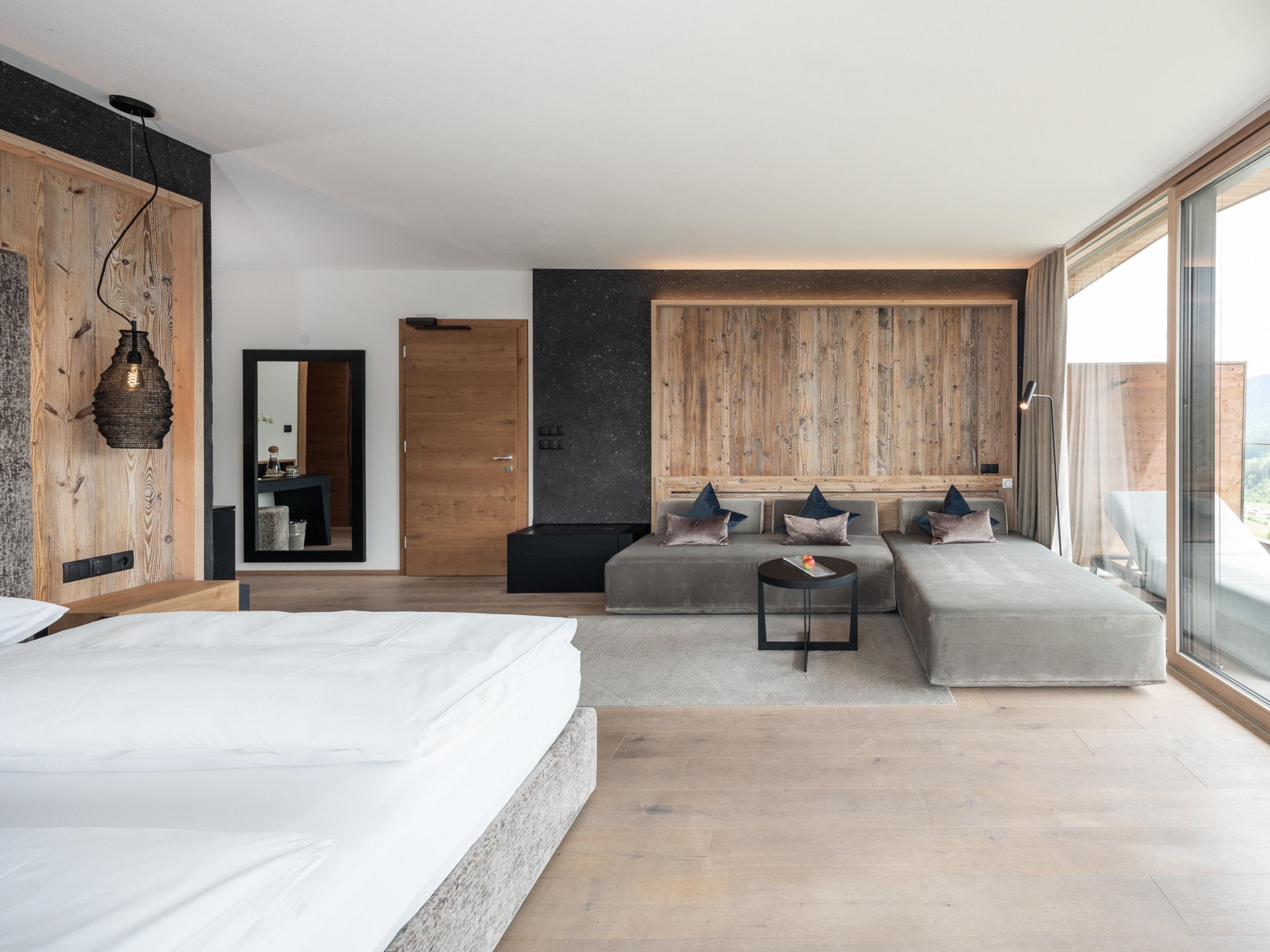 Pavimento in legno. Comodo letto matrimoniale di 2,10 m con spettacolare vista sul mondo alpino. Angolo relax con caminetto “The Flame”. Schermo piatto da 55 pollici. Free WiFi. Cassaforte. Minibar e assortimento di vini. Macchinetta per il caffè Cremesso. Terrazza sul tetto con vasca panoramica e vista da sogno. Lussuoso bagno con doccia partner e vasca. Asciugacapelli e specchio da trucco. WC e bidet separati. Seconda camera da letto con letto matrimoniale, schermo piatto e bagno in camera. Borsa wellness con accappatoi, teli da bagno e ciabattine. Incluso parcheggio sotterraneo.