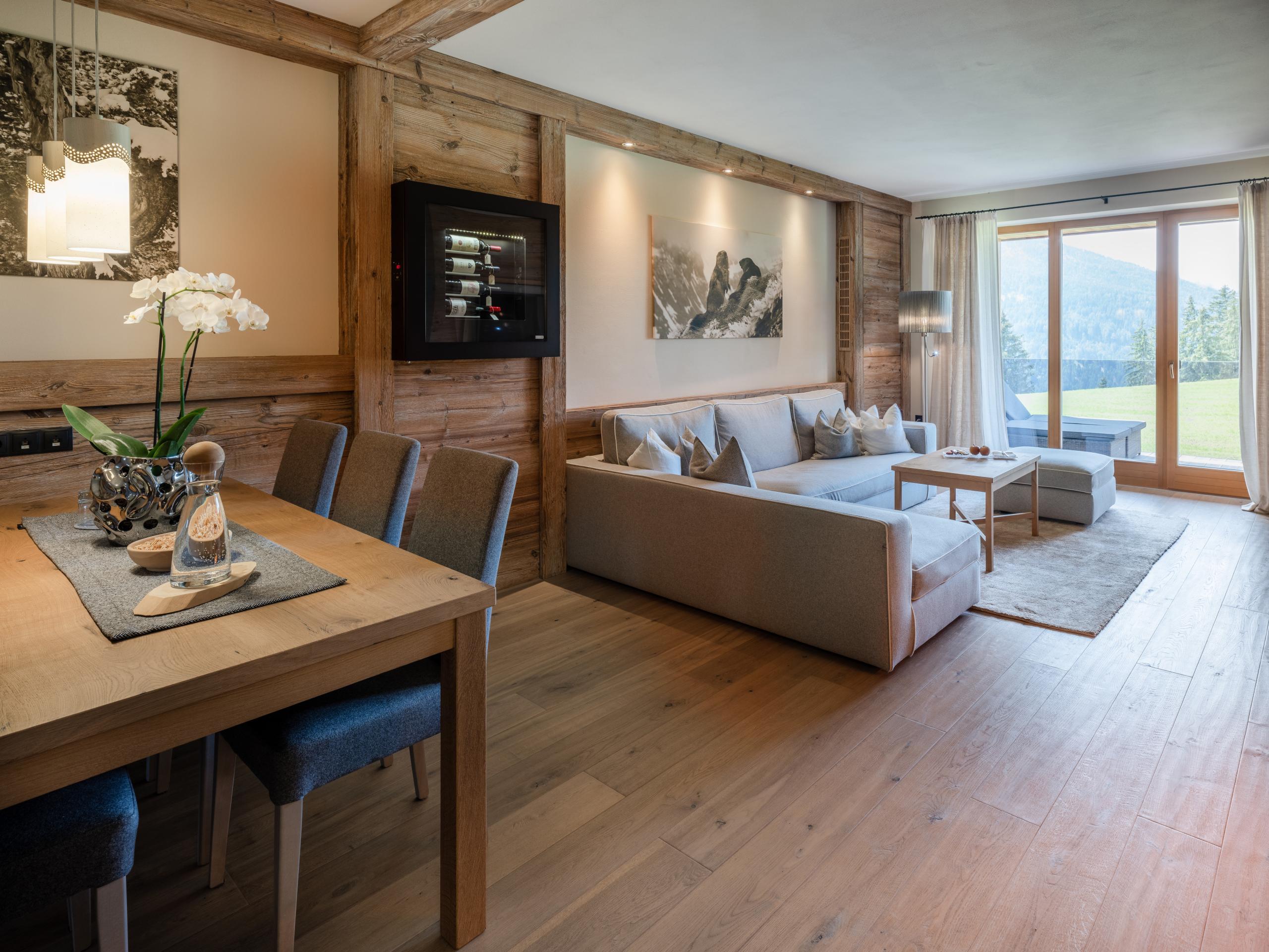 Pavimento in legno. Ampia zona soggiorno con angolo divano. Caminetto “The Flame”. Schermo piatto da 55 pollici. Free WiFi. Cassaforte. Minibar e assortimento di vini. Macchinetta per il caffè Cremesso. Balcone con vista sulla natura. Camera da letto con comodo letto. Schermo piatto da 47 pollici. Bagno aperto con doccia partner emozionale. Asciugacapelli e specchio da trucco. WC e bidet separati. Vasca idromassaggio e sauna a infrarossi. Seconda camera da letto con letto matrimoniale, schermo piatto, bagno in camera e balcone. Borsa wellness con accappatoi, teli da bagno e ciabattine. Incluso parcheggio sotterraneo.
