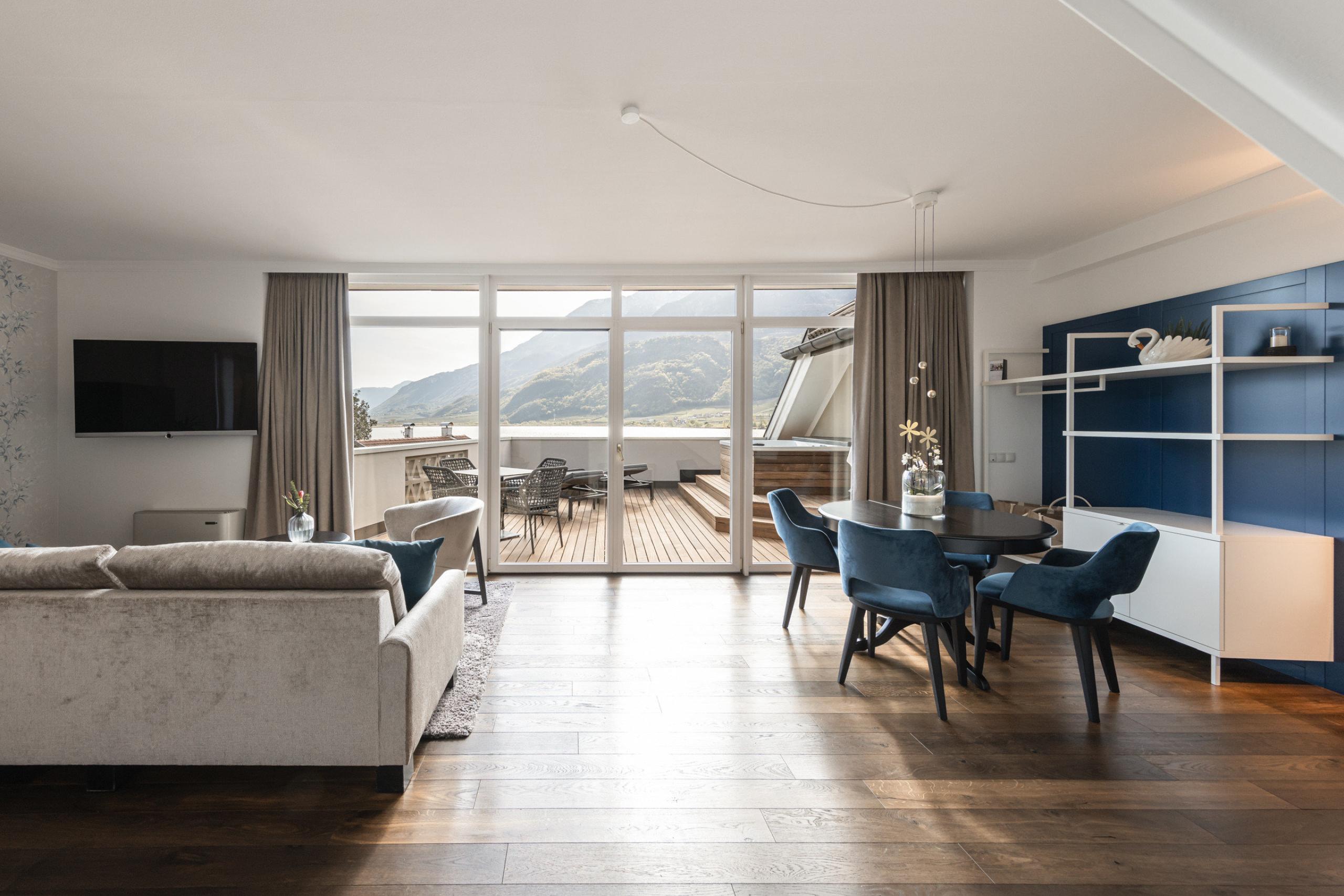Suite panoramica per famiglie, di 58 m², con zona notte e zona giorno molto spaziose. Una suite da sogno al 3° piano, con una generosa terrazza soleggiata di 30 m2 e un panorama sul Lago di Caldaro di straordinaria bellezza.