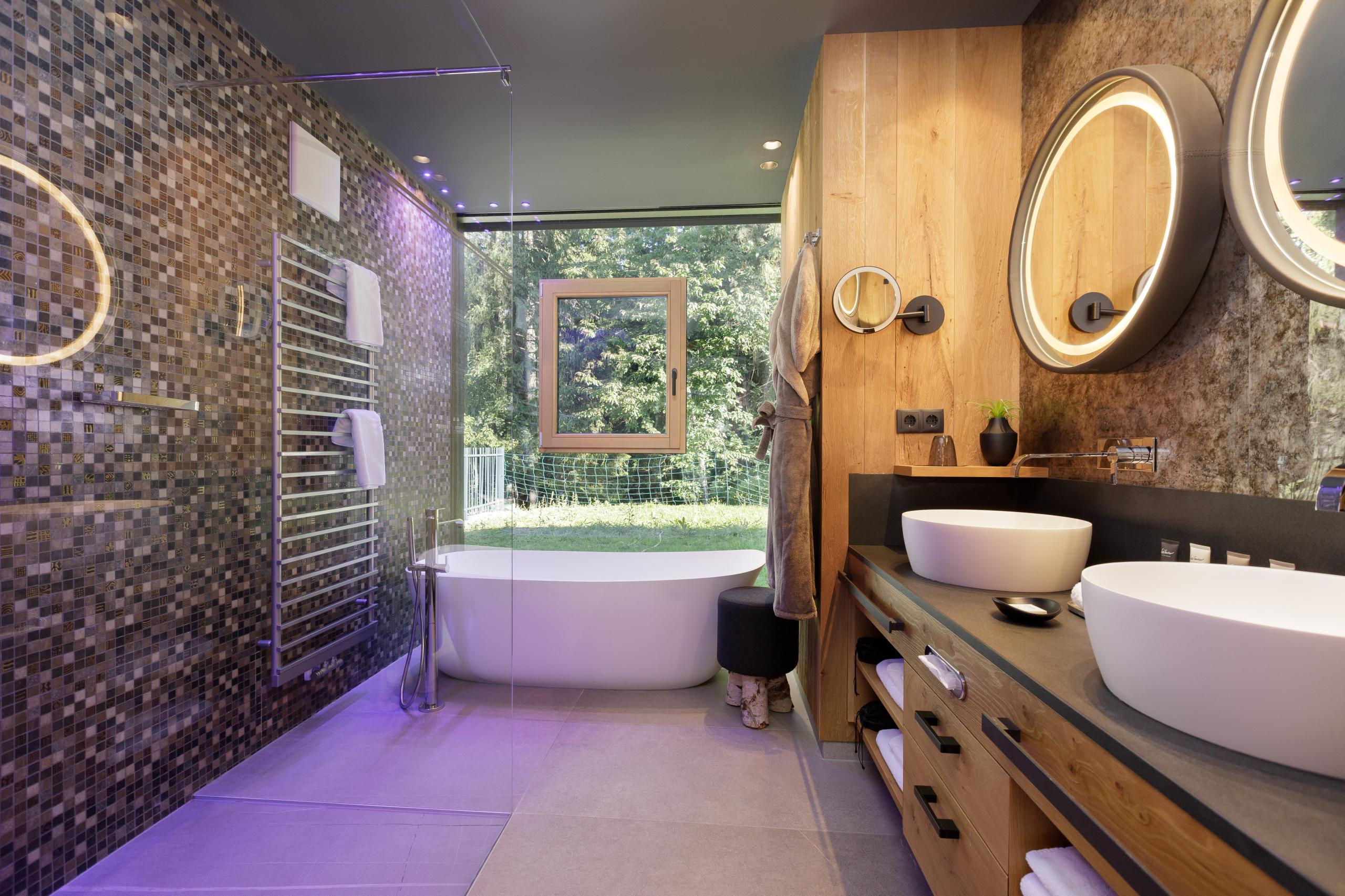 On the upper floor are the two master bedrooms and the separate children's room, each with its own bathroom | one luxury bedroom with flat TV, king-size beds, large balcony with mountain views, bathroom with panoramic bathtub and experience rain shower, double washbasin, noble make-up mirror, separate WC | second bedroom with king-size beds and separate bathroom incl. experience rain shower, separate WC | children's room with bunk beds incl. TV and bathroom with experience rain shower