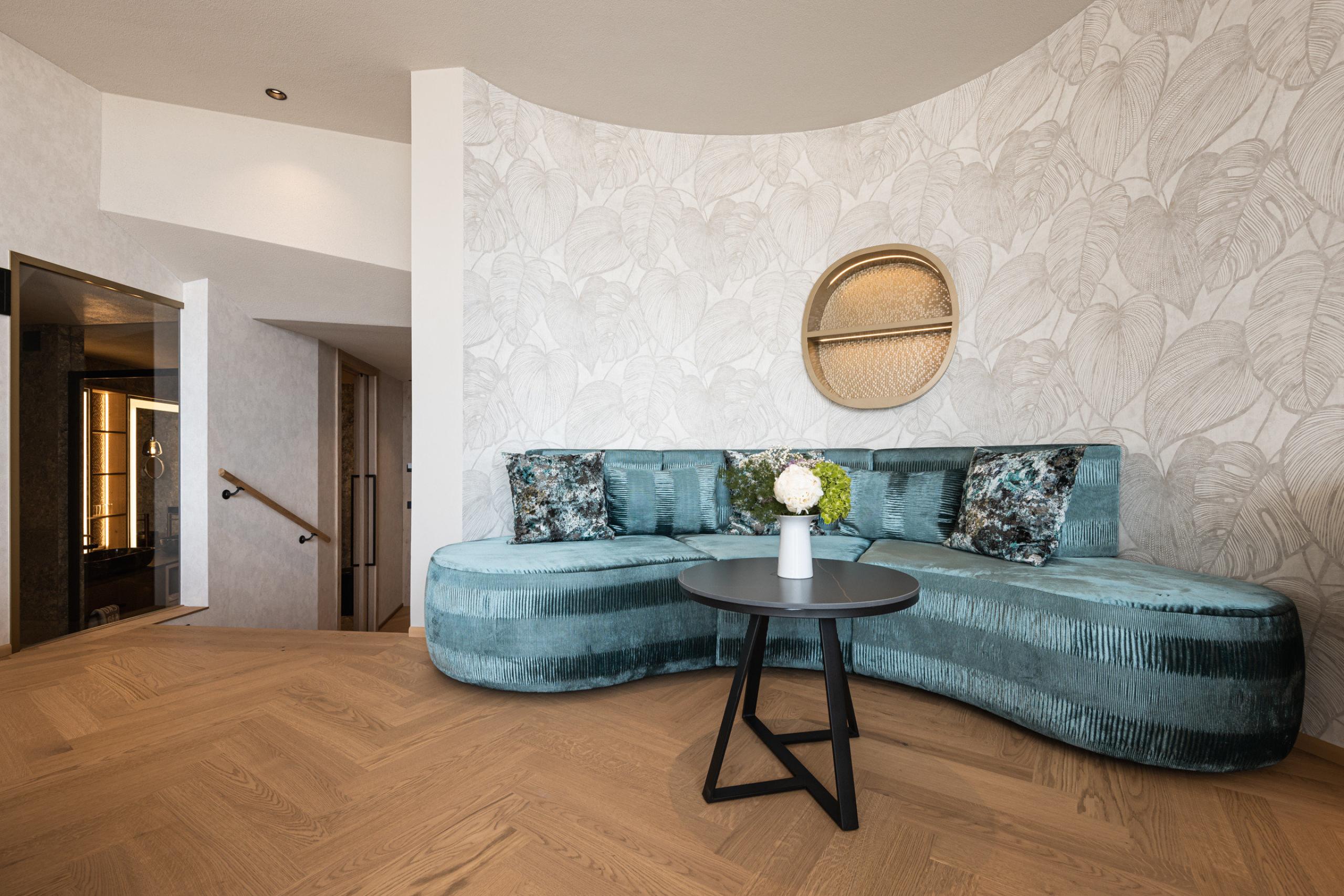 • Light-flooded panoramic spa suite with unique mountain & panoramic views with a staircase from the living room to the bedroom