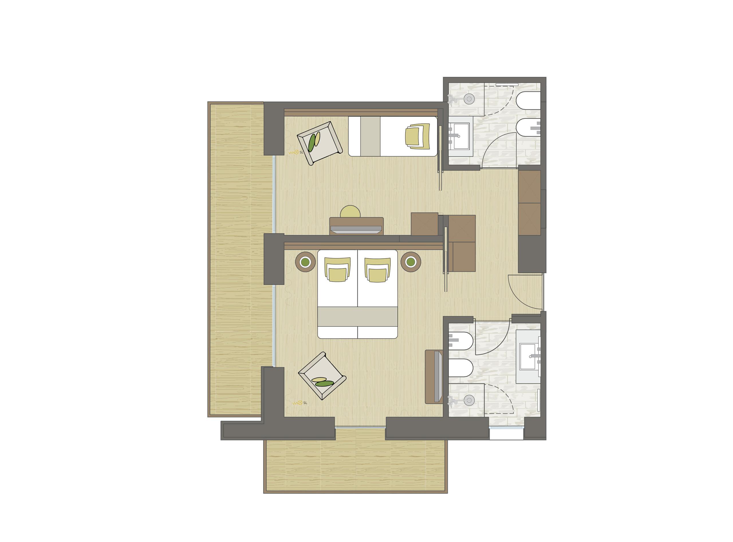 Family room in modern alpine style with 39 m², wood furnishing and floor. Cosy sitting area, double room with king-size double bed and separate room with bunk bed, working table, two bathrooms with shower, WC and bidet, washstand, make-up mirror, hairdryer, telephone, LED satellite TV, safe, minibar, free Wi-Fi. Cosy bathrobes, pool towels, slippers and backpack. Balcony with panoramic view. The images serve as an example, the furniture and the floor plan may vary.
