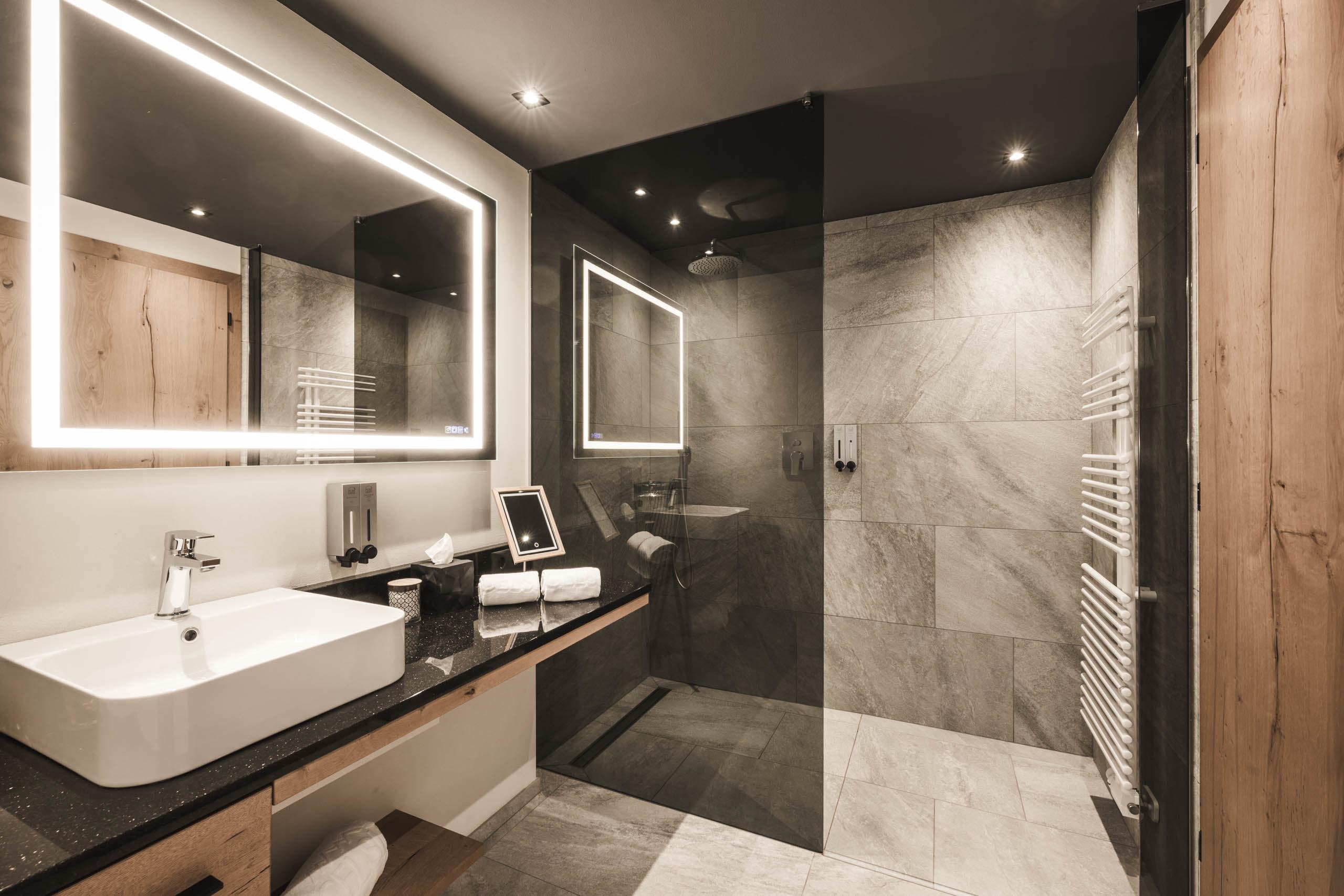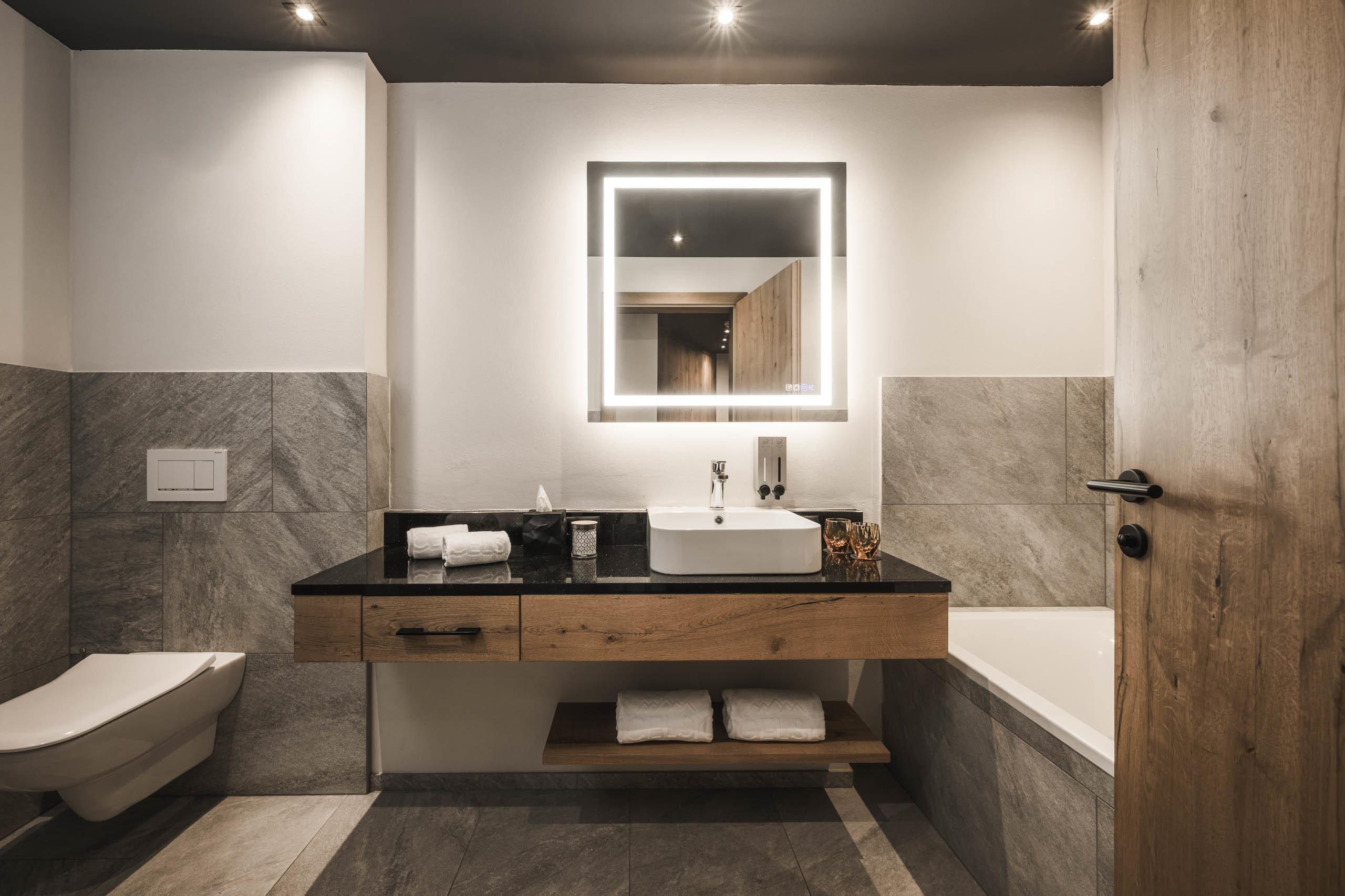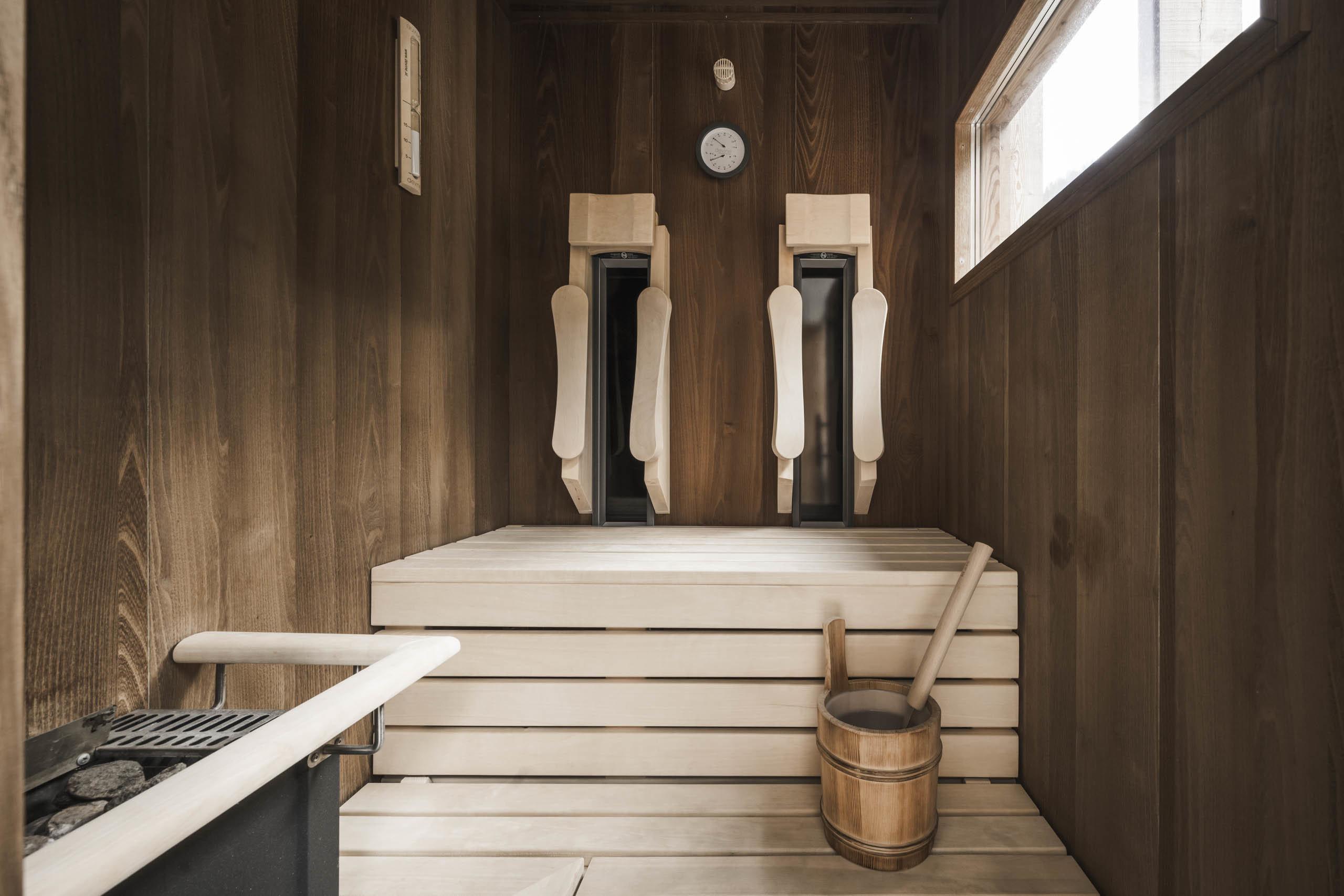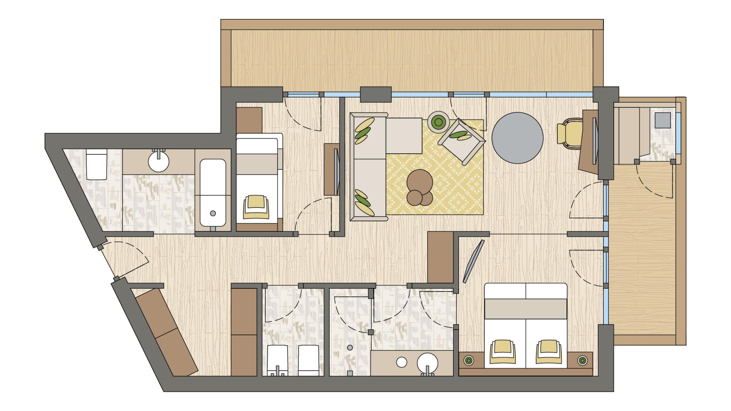 Corner family suite in chalet style with 70 m² and 20 m² balcony, natural wood furnishing and flor. Living room with chaise longue, working table, bedroom with king-size double bed, separate children's room with bunk bed, first bathroom with spacious relaxing shower, WC and bidet separated, double washbasin in marble, lady make-up desk, second bathroom with bathtub, washbasin in marble and WC. Minibar with Nespresso and tea corner, telephone, LED satellite TV, safe, free Wi-Fi. Cosy bathrobes, pool towels, slippers and backpack. Covered balcony with private combined Finnish and infrared sauna. Garage space included. No pets allowed.