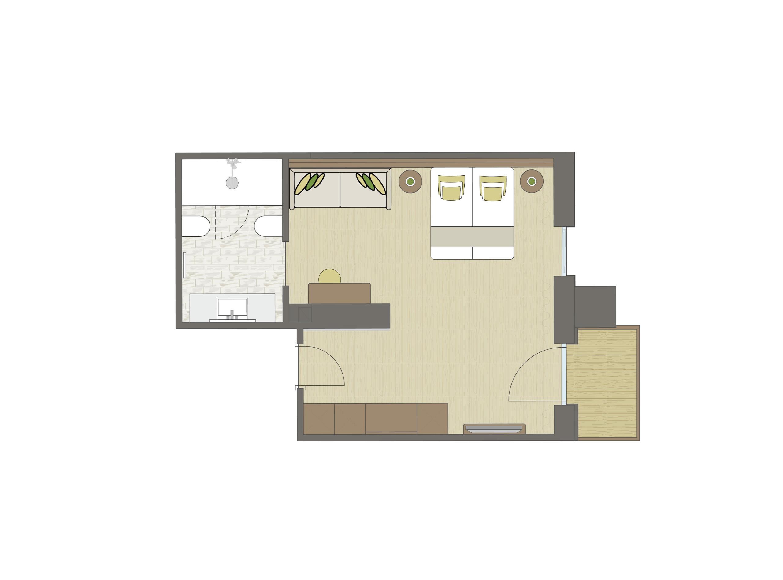 Double room in modern alpine style with 33 m², wood furnishing and floor. King-size double bed, working table, bathroom with shower, WC and bidet, washstand, make-up mirror, hairdryer, telephone, satellite TV, safe, minibar, free Wi-Fi. Cosy bathrobes, pool towels, slippers and backpack. Balcony with panoramic view. The images serve as an example, the furniture and the floor plan may vary.