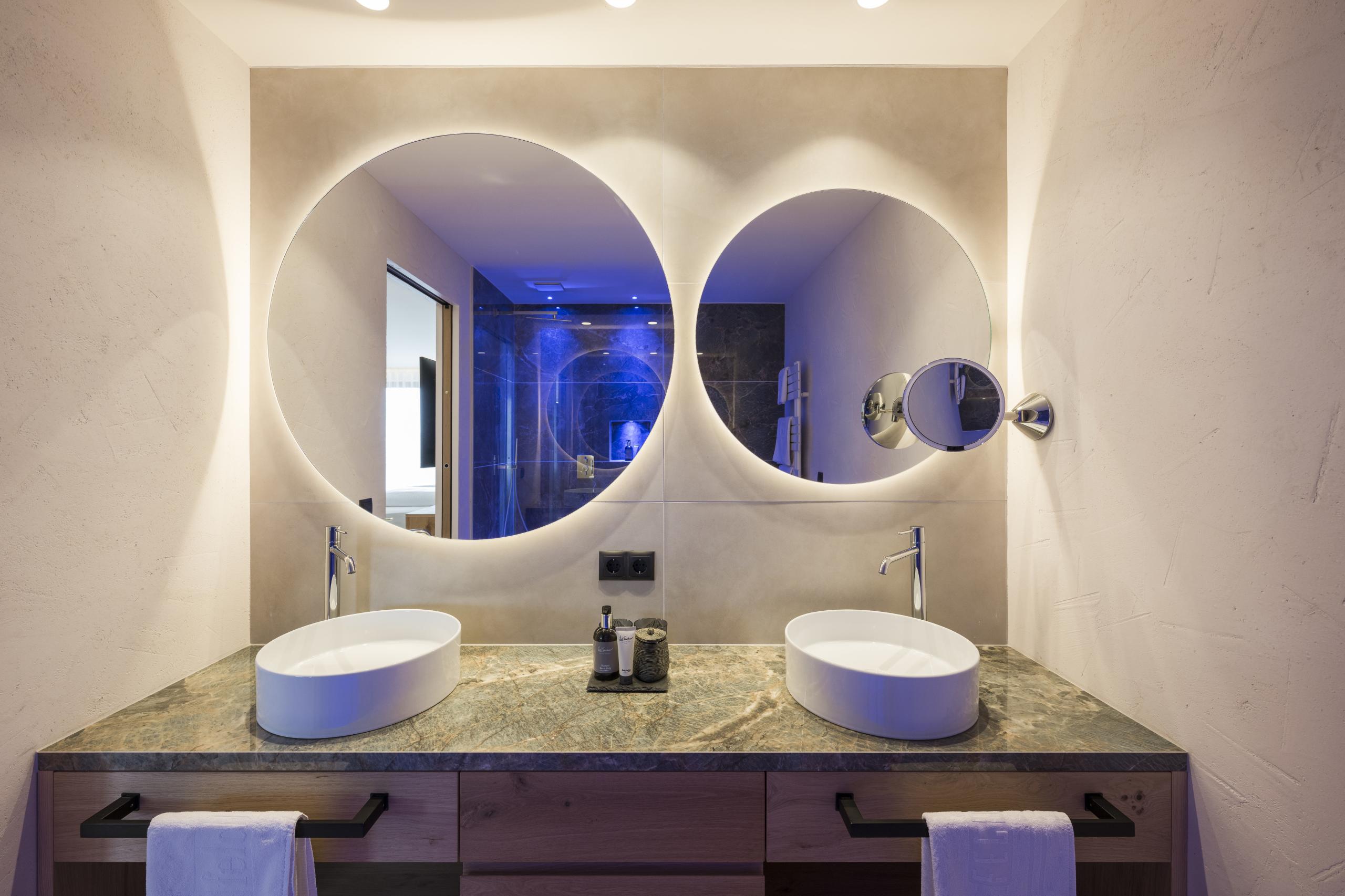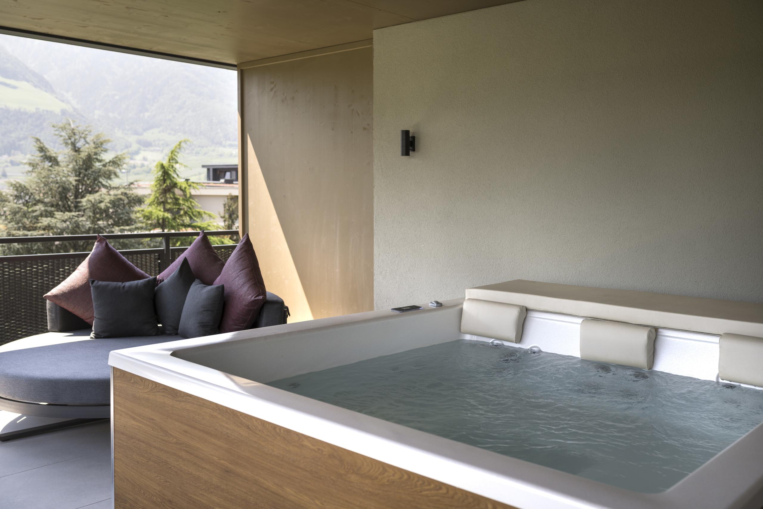 50 m² - Our Relax Suite will amaze you with its own whirlpool on the 40 m² large south-east-facing panoramic terrace with daybed and relax lounger, as well as with the exclusive appointed living room with large, cosy seating corner, wooden floor, natural wood furniture and separate children’s room with two single beds. Also features: spacious walk-in closet, modern bathroom with large walk-in shower, double basin, separate toilet, minibar, safe, 2 flat screen TV, telephone, free WiFi, a garage parking space and air conditioning.