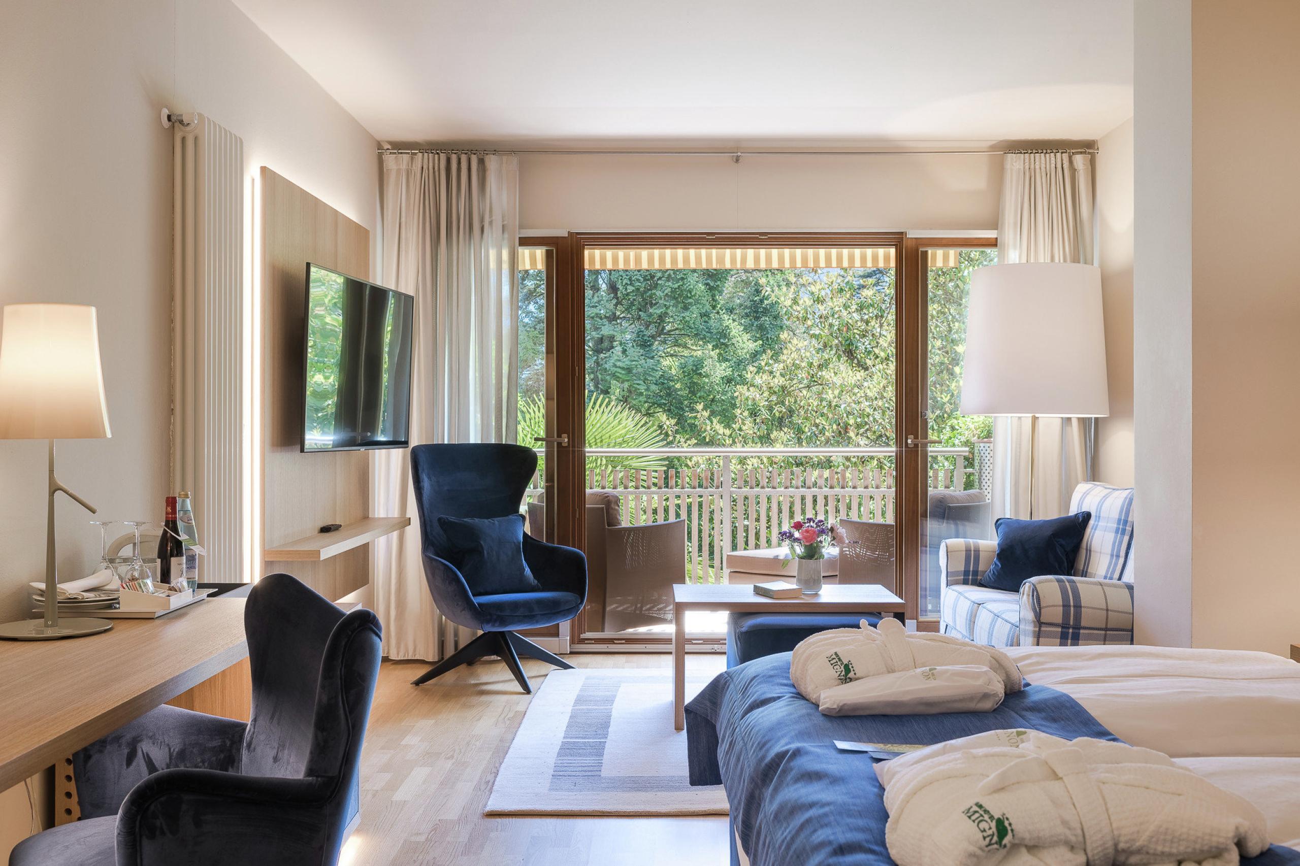 A little more is all that you need. More space, more sun, more peace and more tranquility. Sunny junior suite with lounge-bed, cozy living area and a view of the park, splendid balcony and large bathroom with double sink.