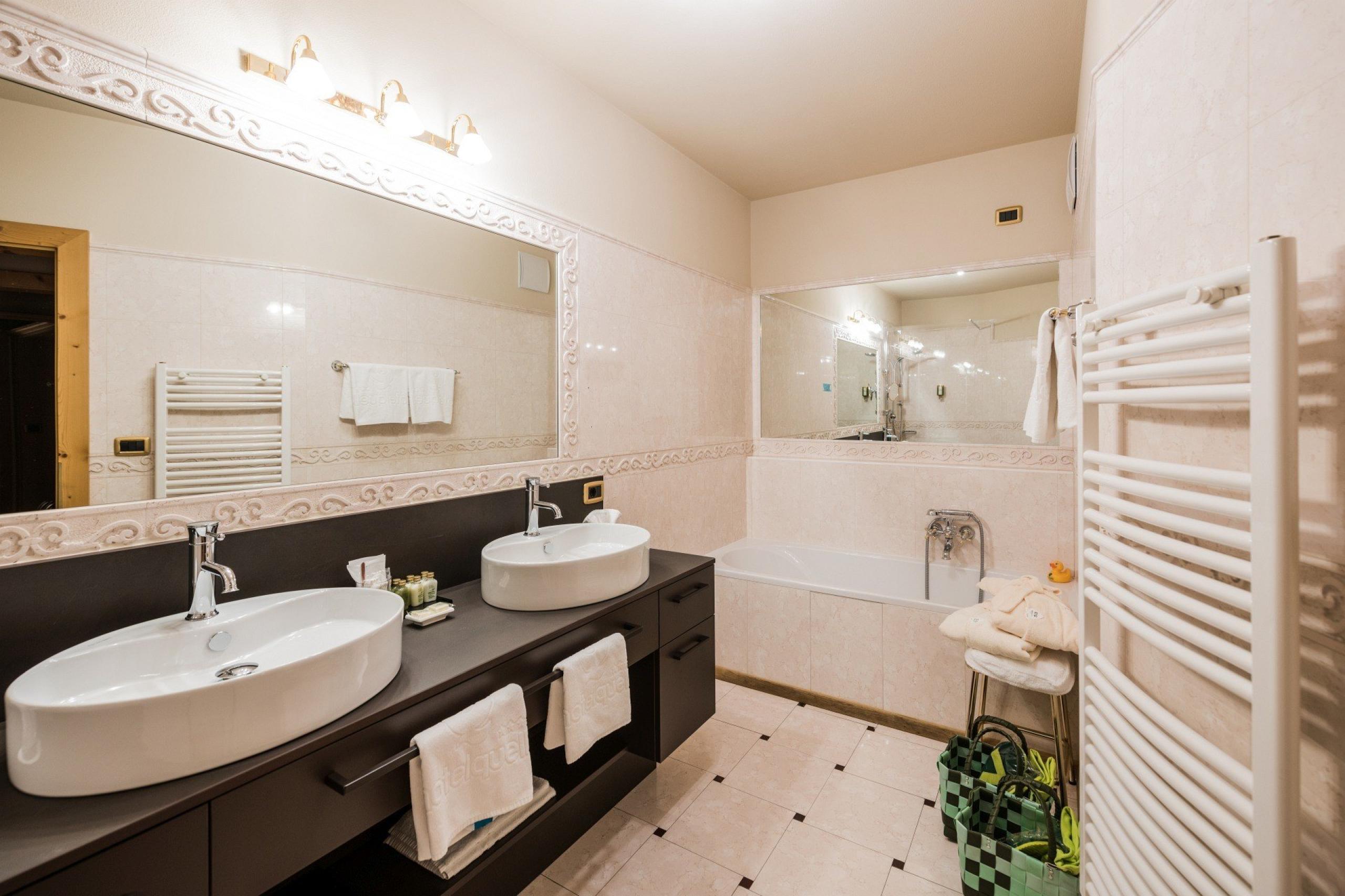 Juniorsuite for 2-4 people. Cozy and comfortably, light sitting area with wood burning ‘Kachelofen’, espresso machine and tea set, well appointed bathroom with shower, bathtub and separated WC/bidet, south facing balcony with view over the Dolomites or to the Infinity pool.