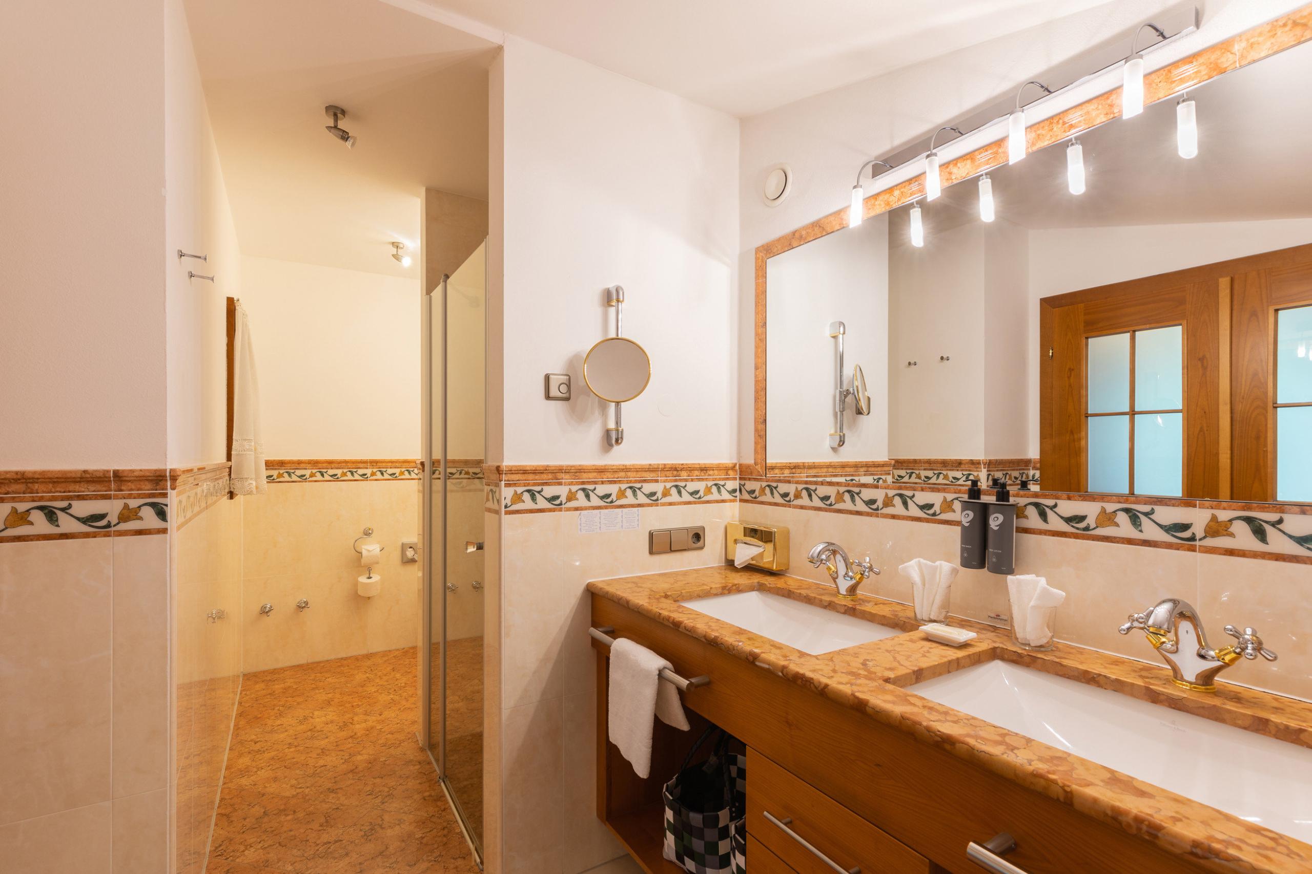 Elegantly furnished in fine cherry wood, bedroom with separatet living room with wooden floor, espresso machine and tea set, large walk-in closet, wonderful bathroom with bathtub and shower, separate toilet/bidet, sunny balcony/terrace with beautiful view of the valley mountain landscape and wellness garden.