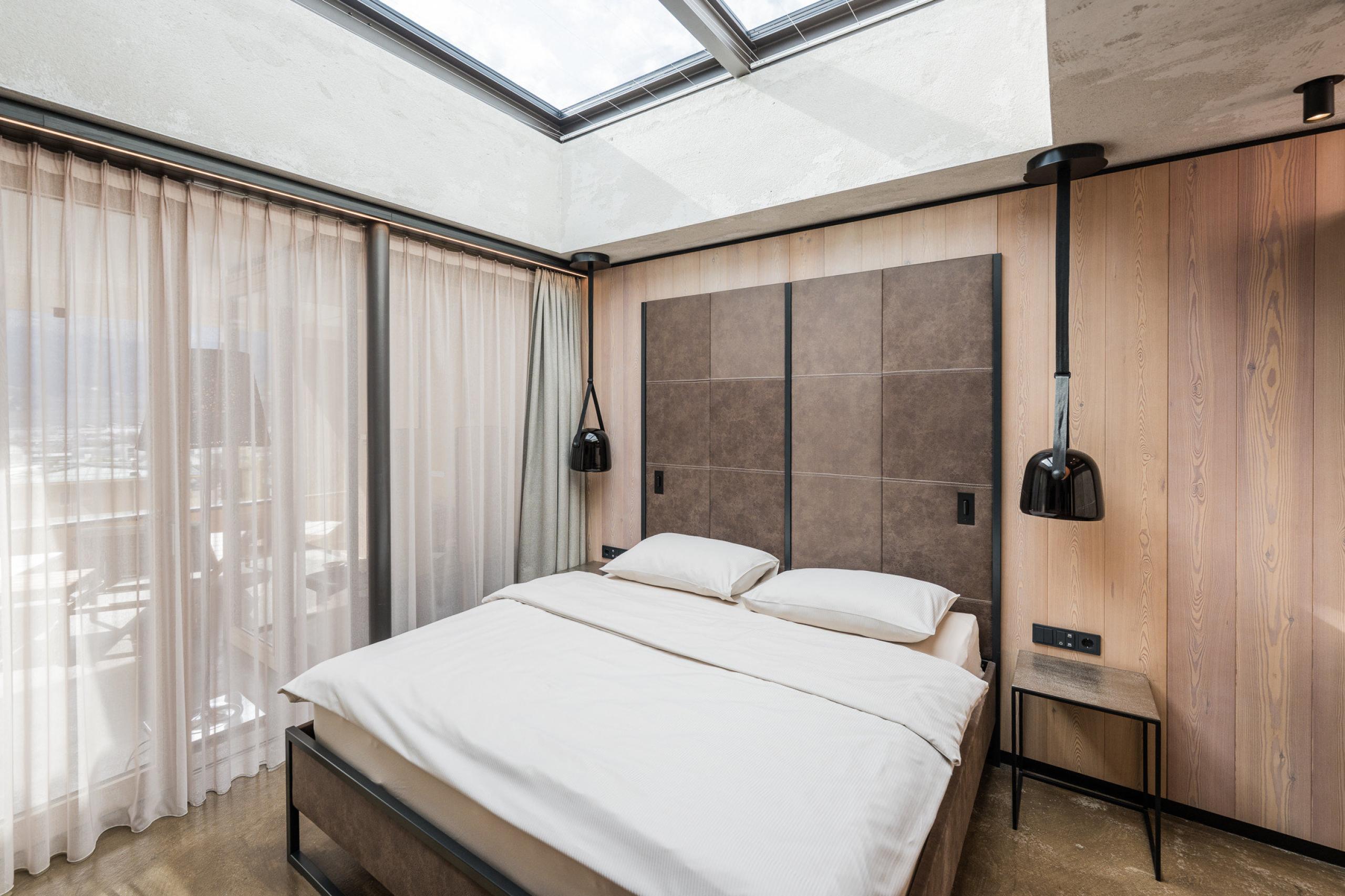 Cosy, modern luxury family suite with 2 bedrooms and a separate living room area, furnishings made of natural materials, natural cement flooring in earth tones, brushed solid local larch wood, rough plaster on the ceiling for pleasant room acoustics, wardrobe and bed made of leather with sky views through the sky light, leather desk with USB port, floor lamp with sofa bed (French size) and designer lounge armchairs with side table, kitchenette (kettle, coffee bar, hob, cocktail bar, large dining table), fireplace, flat-screen TV, home cinema, 2 separate bathrooms with freestanding designer bathtub, bathroom with double sink made of grey South Tyrolean porphyry, shower, toilet and bidet, bathroom radio playing relaxing wellness music, free Wi-Fi, minibar, safe and garage,