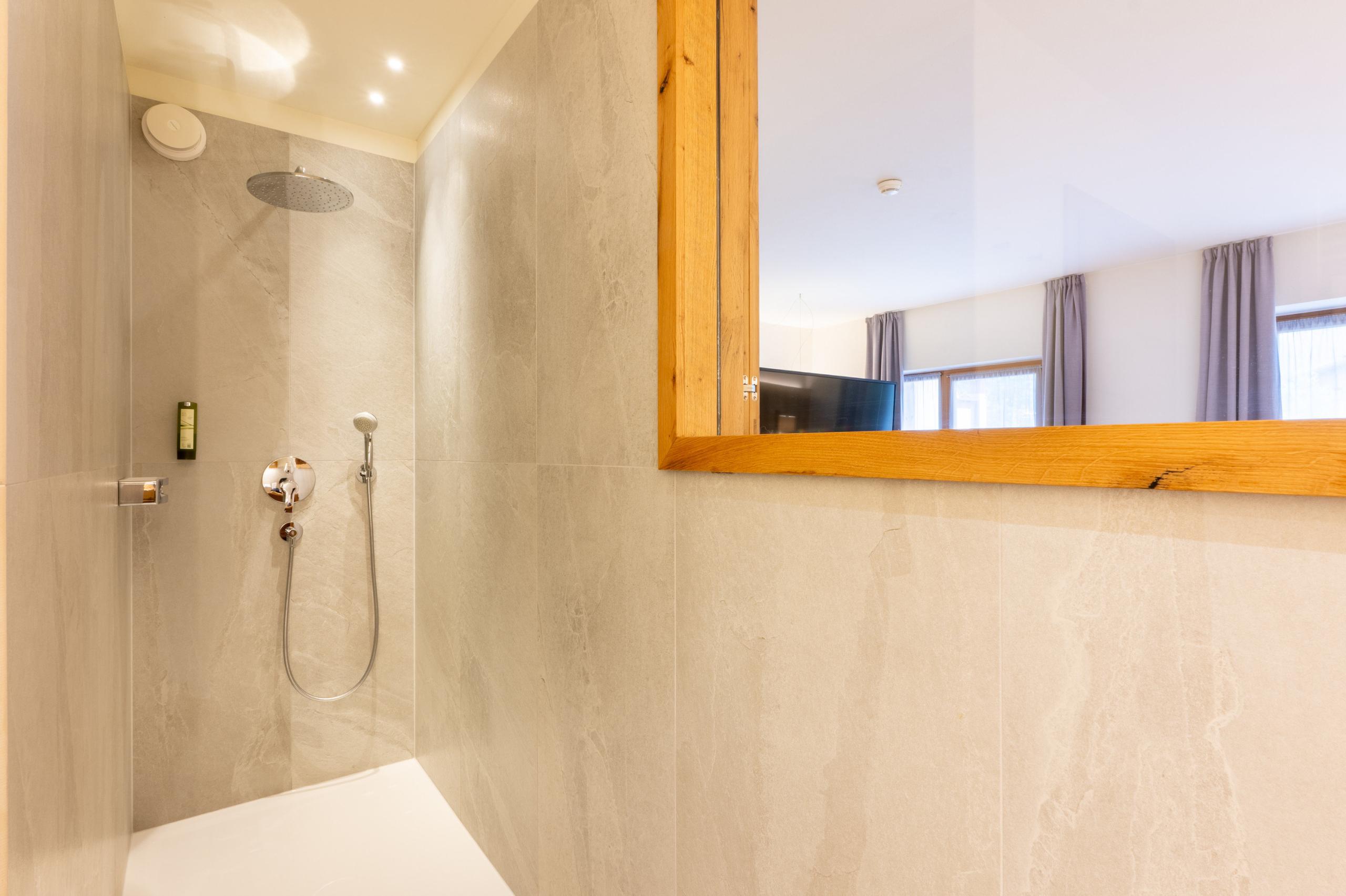 This generous accomodation with old oak wood, old spruce wood in alpine barn style and natural flagstone, modern lighting, has bath with large shower, separate WC with bidet and sink, large entrance room with walk-in cupboard. bedroom with double bed, Sat-Smart-FullHd-Led-TV, internet access and balcony with a wonderful view on the Mirabell Garden and the Valdaora Dolomites.